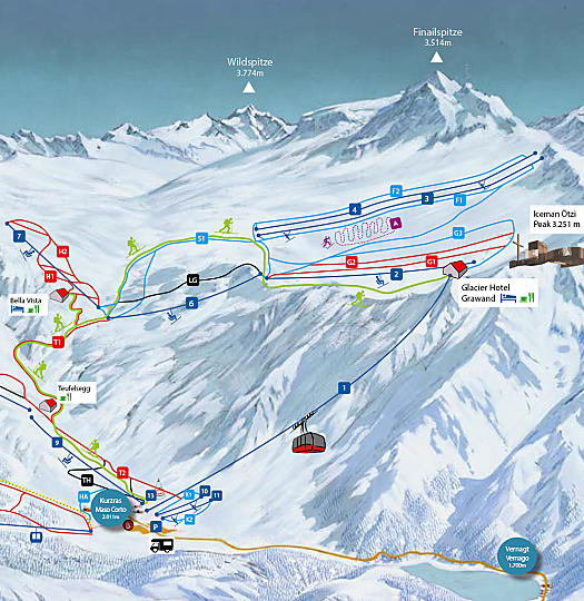 • È possibile raggiungere l'area dell'Alpin Arena Senales solo sul percorso di sci alpinismo designato (contrassegnato in verde sulla mappa delle piste) negli orari di apertura dalle 09.00 alle 16.30.